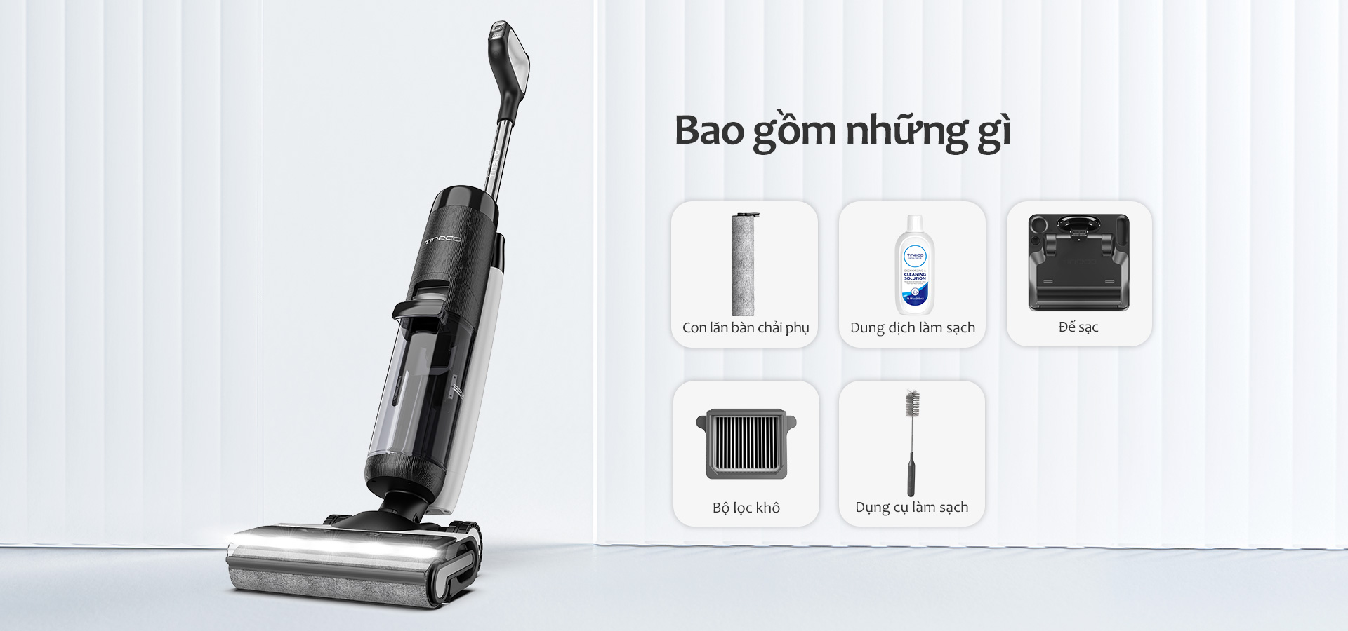 Một đế cắm tối giản cất giữ FLOOR ONE S7 PRO và các phụ kiện thay thế một cách thuận tiện, đồng thời cho phép tự làm sạch và sạc một cách ngăn nắp, gọn gàng.
