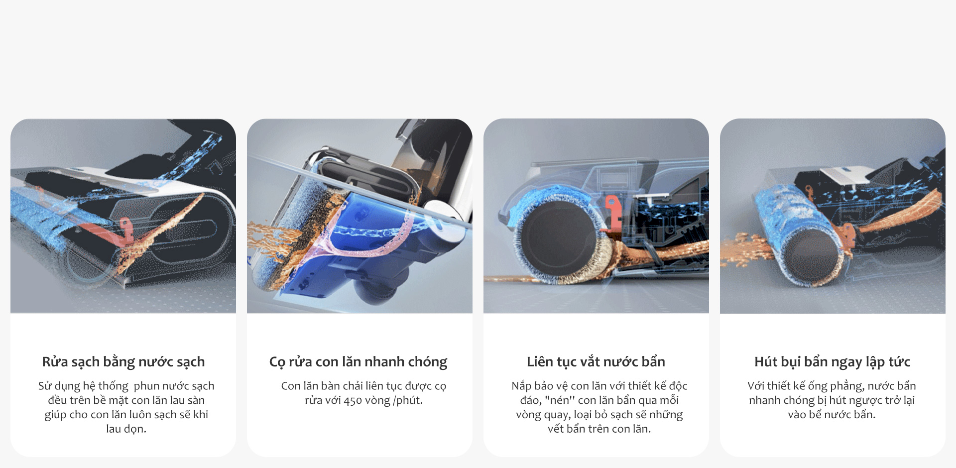 Làm sạch sàn nhà cũng như làm sạch con lăn chổi bằng Hệ thống dòng nước áp suất cân bằng. Chu trình tự làm sạch FLOOR ONE S7 PRO làm sạch sâu con lăn bàn chải và ống hút để bảo trì kỹ lưỡng. Sau khi làm sạch, tính năng sấy ly tâm sẽ loại bỏ nước khỏi trục lăn một cách hiệu quả và ngăn ngừa nấm mốc và vi khuẩn lây lan.