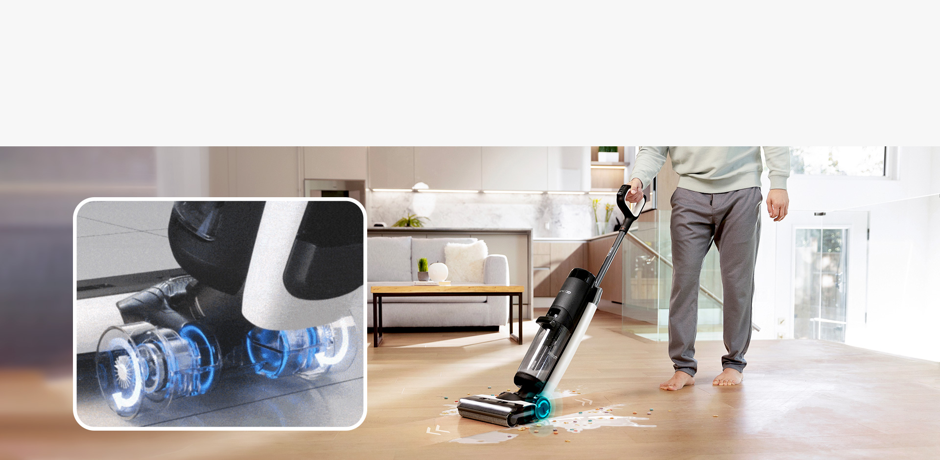 Với thiết kế được nâng cấp con lăn tràn viền 2 bên, FLOOR ONE S7 Pro có khả năng lau hút sạch dọc theo chân tường và các góc cạnh trong nhà cực kỳ khó tiếp cận, trong phạm vi 1 cm ở cả hai bên, đầu cọ đảm bảo trải nghiệm vệ sinh không còn sót lại bụi bẩn ở từng góc độ.