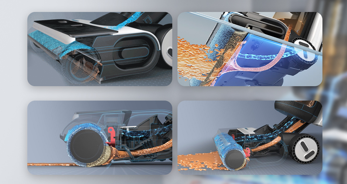 Bốn bước đảm bảo con lăn sạch cho sàn nhà sạch: rửa đều bằng nước sạch, giặt ở tốc độ cao, vắt nước bẩn liên tục và hút bụi ngay lập tức.